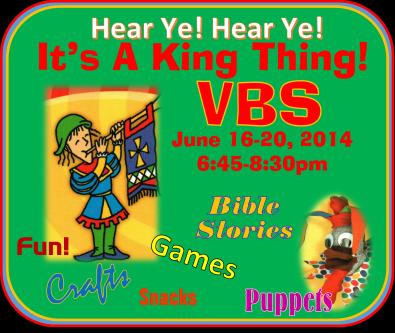 VBS is coming soon and we’re very excited! We will be using “It’s a King Thing!” materials published by David C. Cook to study different Kings & Queens from the Bible each night from 6:45 to 8:30 pm. Come learn about Saul, David, Solomon, Esther, and Nehemiah. There will be lots of fun and activities, plus special guest appearances by puppets Lady Legomutton and Chester the Jester. Lots of summer fun that Preschool thru Elementary kids will love!