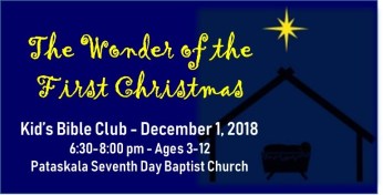 Beginning Saturday evening, December 1, 2018 is a new Kids Bible Club starting at the Pataskala Seventh Day Baptist Church. One Saturday night each month the church will host activities for children ages 3-12 consisting of age-appropriate Bible Lessons, Crafts, Singing, Games, and Snacks.