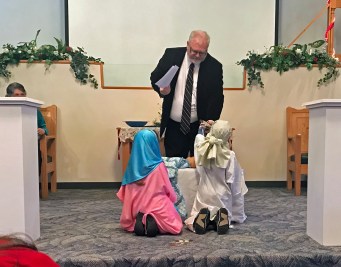As part of the dedication service Elias’ older sister Cora and cousin Josiah Van Horn enacted the story of when Mary and Joseph brought their baby son Jesus to the temple to dedicate him found in Luke 2:22-24.
