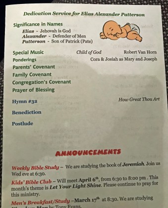A baby dedication service was held during the worship service on Sabbath March 9, 2019 for Elias Alexander Patterson, son of Jamie and Marissa Patterson (and sister to Cora). Pastor Robert Van Horn (and proud grandfather) led the time of dedication which included special music, a covenant of dedication by the parents and confirmation of support by the many family members present and also the church family. Earlier in the service Pastor Robert had read Children Learn What They Live and this sentiment was captured in the covenant by Marissa and Jamie Patterson.